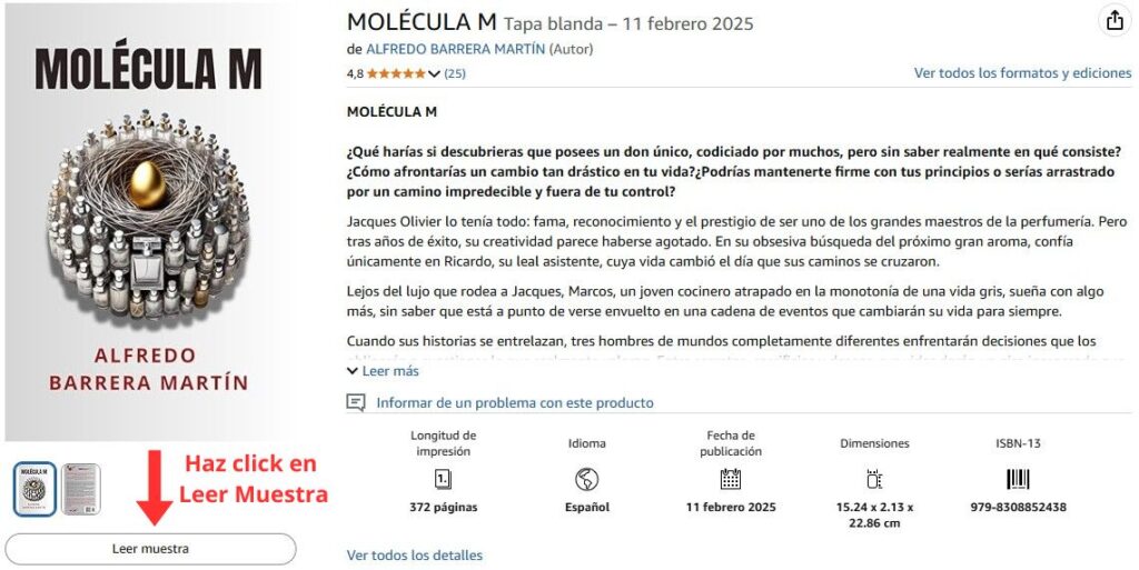 Aprovecha y lee las primeras páginas del libro gratis, antes de comprarlo, para comprobar si realmente te gusta. Para ello, ve a Amazon, busca "Molécula M" y haz click en "Leer Muestra". Podrás leer los primeros capítulos de forma gratuita y sin compromiso.